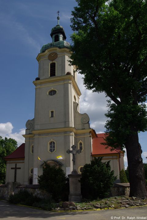 Die der hl. Margareta-von-Antiochia geweihte Kirche in Krascheow wurde zwischen 1910 bis 1913 in neobarockem Stil erbaut. Die Orgel, Altäre und die Kanzel wurden in Regensburg angefertigt. Als besondere Sehenswürdigkeit enthält sie in einem Seitenaltar eine sehr alte Kopie des Muttergottesbildes von Tschenstochau. Diese wird auf das 17. Jahrhundert datiert. Von besonderer Bedeutung für die Verbreitung der Mariendarstellung im Tschenstochauer Typ auch in Oberschlesien muss der Beschluss der Krakauer Synode von 1621 gewesen sein, das Bild in Tschenstochau als Vorbild für die ikonographische Darstellung der heiligen Jungfrau Maria zu verwenden. Das Bild in Krascheow wird daher wohl kurz danach entstanden sein.