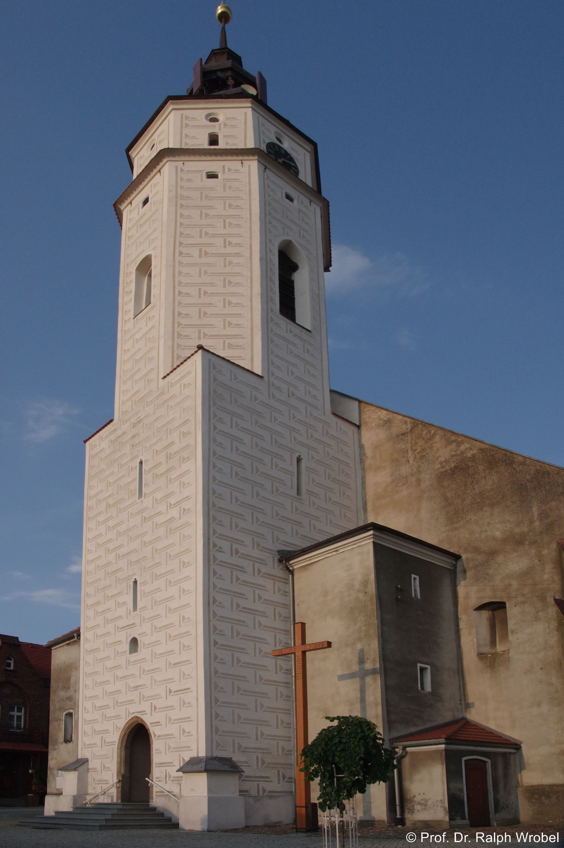 Die ursprünglich gotische Saalkirche aus dem 14. oder 15. Jahrhundert wurde nach einem Brand im Jahre 1544 umgebaut und wesentlich erweitert. Der Westturm mit achteckigem Aufsatz und flacher Barockhaube aus dem 16. Jahrhundert wurde im 20. Jahrhundert rekonstruiert. Er ist mit einer Sgraffittomalerei (Diamantquader) verziert. Der Hauptaltar mit einer Figurengruppe der Himmelfahrt Mariens stammt aus dem Jahr 1773. Die Kirche enthält zahlreiche Epitaphien, darunter das halbfigürliche Epitaph des Paul Raschitz Koslowski von Koslaw auf Piechotitz und Jamka aus dem Jahre 1595.