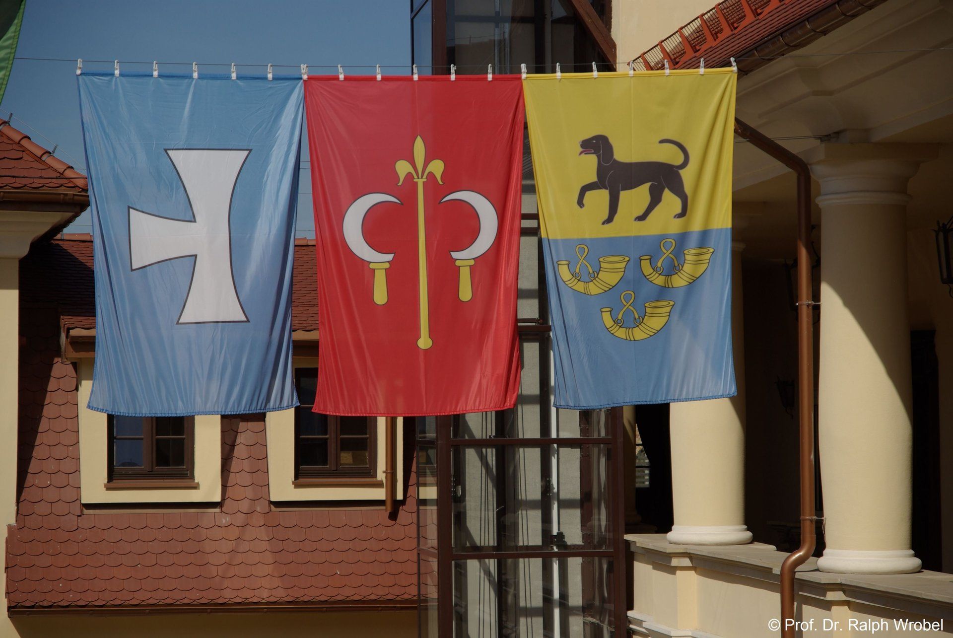 Flaggen mit den Wappen historischer Besitzer im Schlosshof
