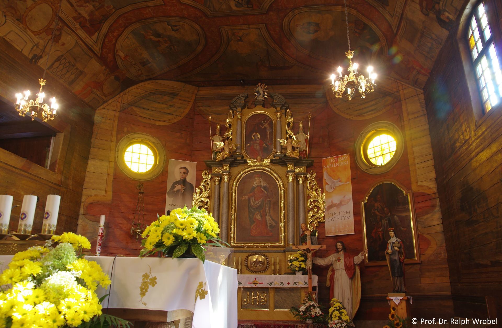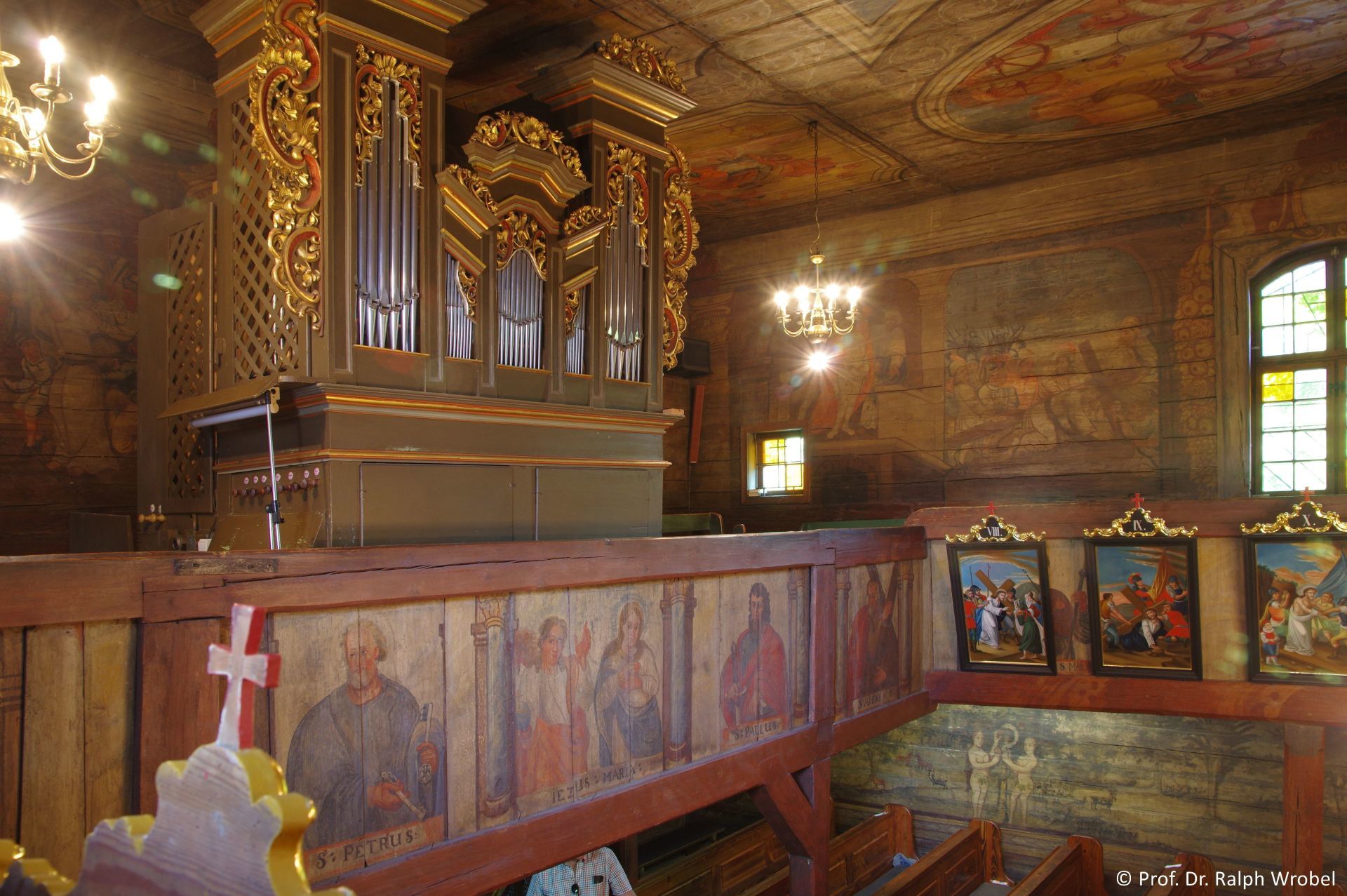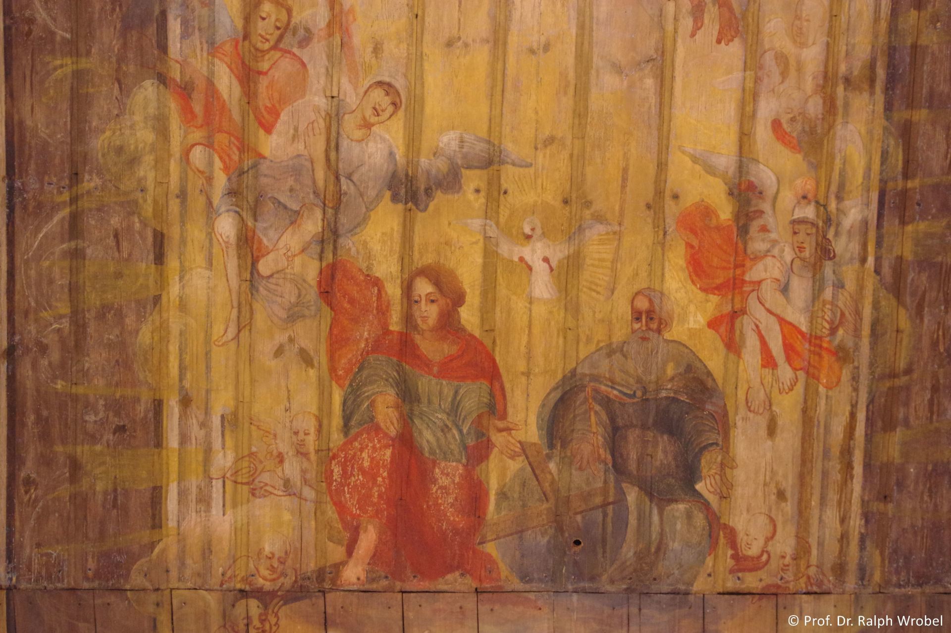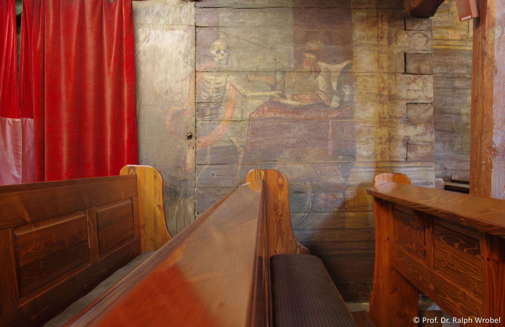 Auch die Decke des Hauptschiffes ist flach und bemalt, die des Chores seitlich abgeschrägt. Hier befinden sich weitere gut erhaltene Wandmalereien aus dem 18. Jahrhundert, die in den Jahren 1970 bis 1979 entdeckt und erneuert wurden. Dabei handelt es sich um eine frühneuzeitliche „Biblia Pauperum“ mit Darstellungen aus dem Alten und dem Neuen Testament.