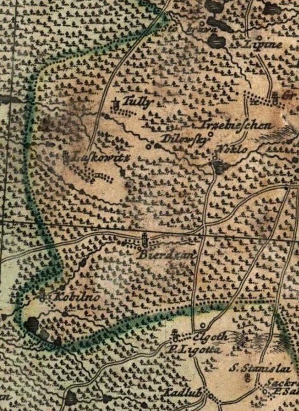 Das Dorf „Birdzan“ wird erstmalig in einer Urkunde aus dem Jahre 1279 erwähnt. Im Jahre 1410 soll hier an der Stelle der heutigen Pfarrkirche eine erste hölzerne Kapelle errichtet worden sein. Der kleine Ort mitten in den Wäldern zwischen Oppeln und Rosenberg bestand vermutlich im 17. Jahrhundert nur aus einer Wassermühle, einem Sägewerk, einer Brennerei, einem Forsthaus, einer Schule sowie wenigen Bauernhöfen. Über die Besitzer des Dorfes ist wenig bekannt. Lange Zeit gehörte es zur Herrschaft Turawa. Diese Besitzungen wurden im Jahre 1711 von einem Baron von Blankowsky an Martin von Löwencron verkauft. Die Kirche in Bierdzan wird vermutlich im selben Jahr als Schrotholzbau errichtet worden sein. Später kam die Herrschaft durch Erbschaft in den Besitz der Familie von Garnier, welche dieselbe im Jahre 1794 in einen Fideikommiss umwandelte. In der Mitte des 19. Jahrhunderts bestand der Ort bereits aus 13 Bauern und 29 Gärtnerstellen. Hinzu kamen 18 Häusler sowie eine Schule. Eine eigenständige Pfarrei Bierdzan wurde im Jahre 1841 gegründet, 1874 ein Amtsbezirk Bierdzan. Im Jahre 1885 hatte der Ort 832 Einwohner.