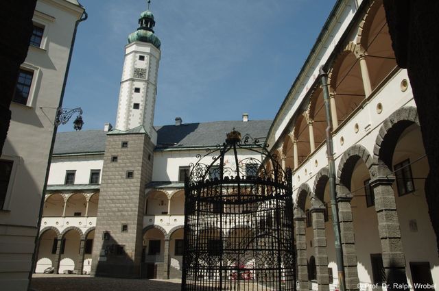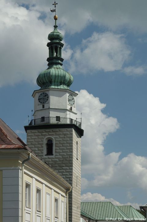 Der historische Stadtkern von Freudenthal mit Schloss und Pfarrkirche steht heute unter Denkmalschutz. Am Ring befinden sich das Rathaus, zahlreiche historische Bürgerhäuser und einige Geschäfte. (unten)