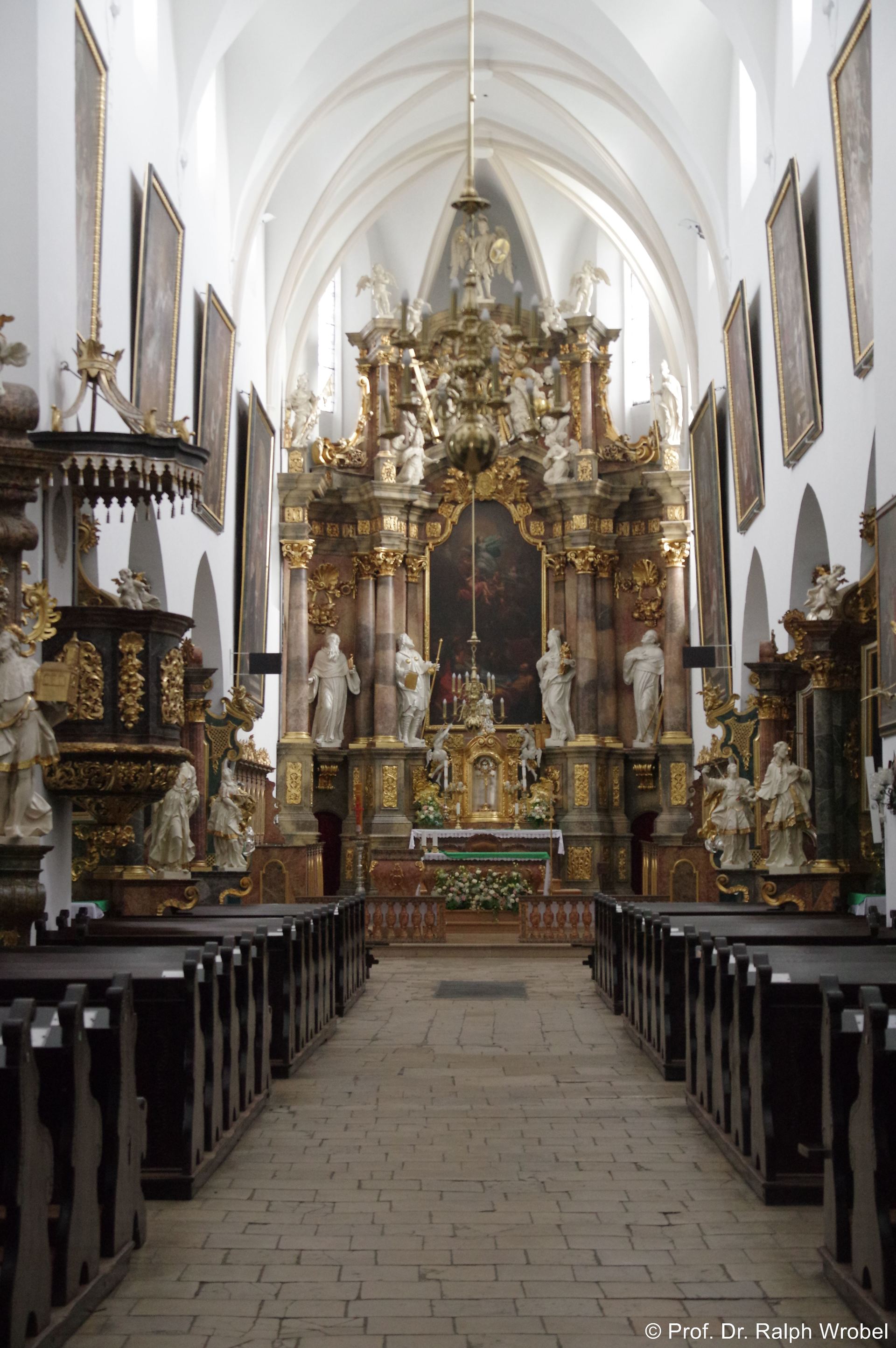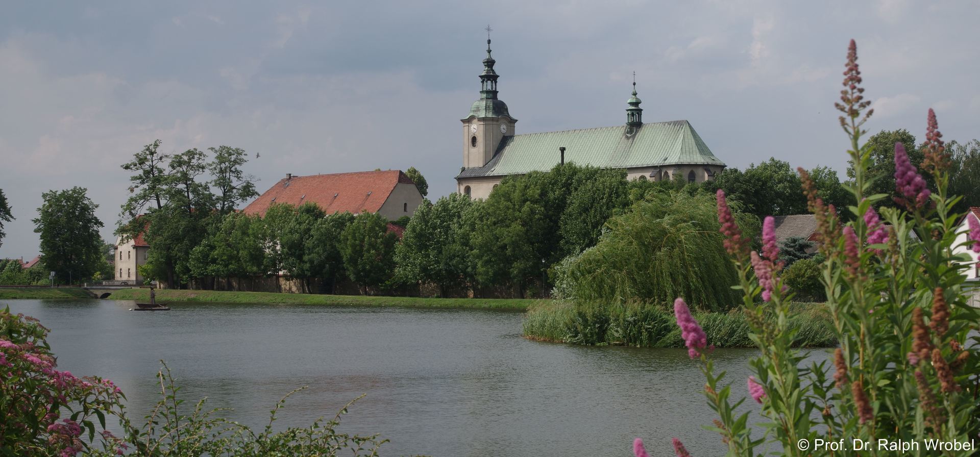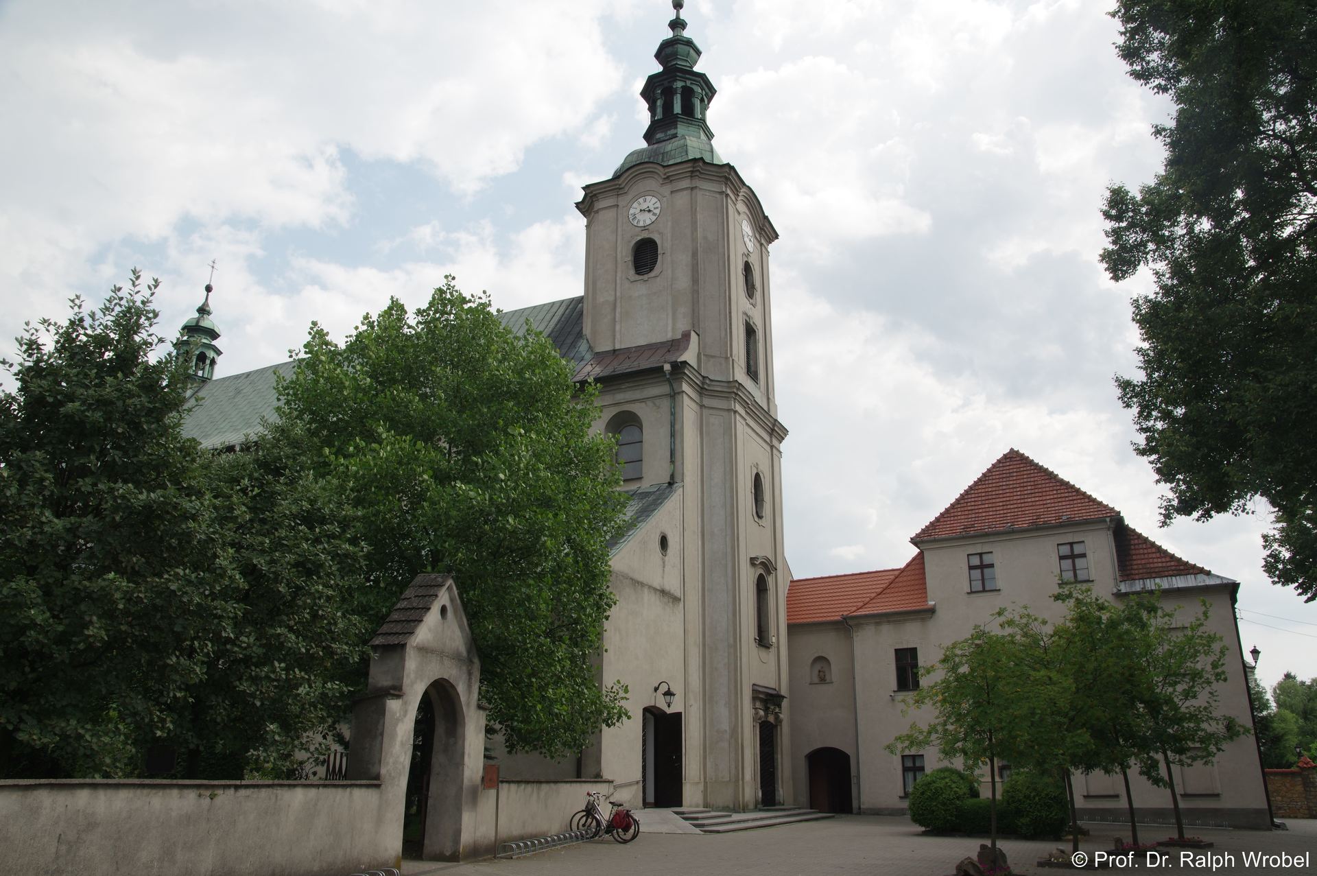 Die Kirche wurde im 13. und 14. Jahrhundert errichtet, nach mehreren Bränden im 17. und 18. Jahrhundert zwischen 1738 und 1740 grundlegend erweitert und in der Folgezeit mehrfach renoviert. Die dreischiffige Basilika ist ein Stein-Backstein-Bau mit Strebepfeilern und einem im Ostteil noch gotischen Chor. Die Kirche ist durch die Sakristei mit dem Klostergebäude verbunden. Der Hauptaltar der Kirche stammt aus dem Jahr 1734 im Régence-Stil zeigt die Himmelfahrt Marias. An den Pfeilern in der Kirche sind zudem acht Rokoko-Altäre aus der Mitte des 18. Jahrhunderts. Die Kanzel von 1769 ist reich dekoriert. In der Kirche befinden sich zudem viele Gemälde aus der Werkstatt von Michael Willmann.