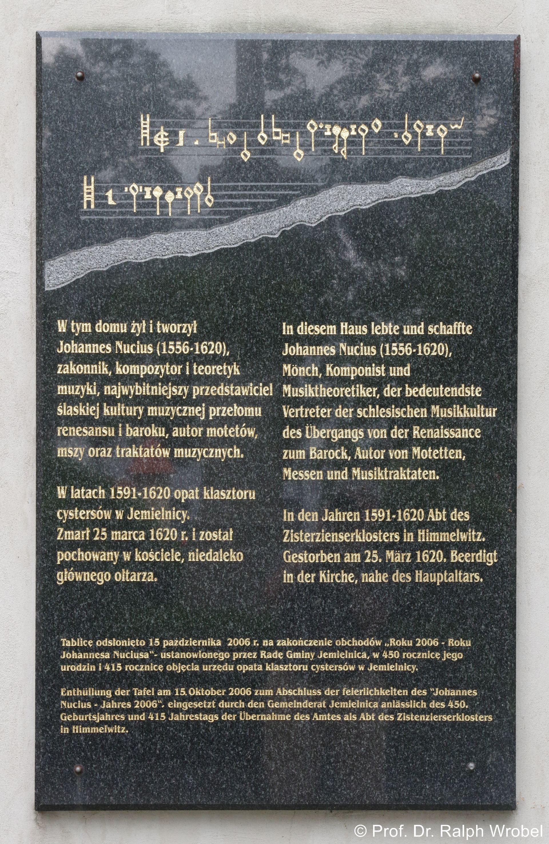 Zwischen 1591 und 1620 wirkte im Kloster Himmelwitz der in Görlitz geborene Johannes Nucius als Abt. Der Komponist gilt als „Meister der polyphonen Motette“. Durch seine Kompositionen und seine musiktheoretischen Werke gehört er zu den Begründern der musikalisch-rhetorischen Formenlehre. Im Jahre 2006 wurde ihm zu Ehren – zum Abschluss der Feierlichkeiten zum „Johannes Nucius – Jahres“ an der Klosterkirche eine zweisprachige Tafel angebracht.