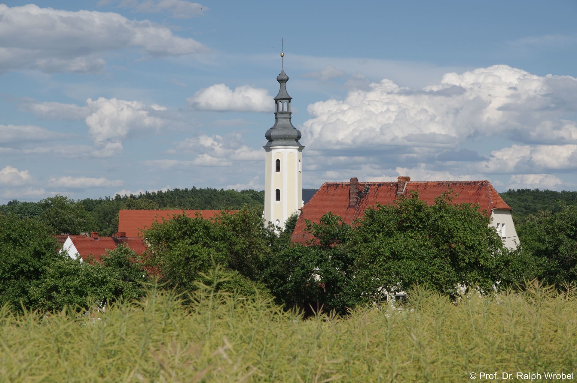 Der heutige Bau der römisch-katholischen Pfarrkirche Mariä Himmelfahrt stammt noch aus dem 16. Jahrhundert, wurde aber im 18. Jahrhundert im Barockstil umgebaut. Der Seitenchor entstand z.B. im Jahre 1755. Über dem Eingang zur Pfarrkirche befindet sich bis heute – wohl zur Erinnerung an den Wiederaufbau der Kirche nach dem Brand von 1796 – das Wappen der Äbte von Leubus mit der Jahreszahl 1799 und der Abkürzung G.A.L. (Wohl für Gabriel [Otto], Abt von Leubus.) Der bis heute erhaltene Glockenturm entstand wohl in derselben Zeit.