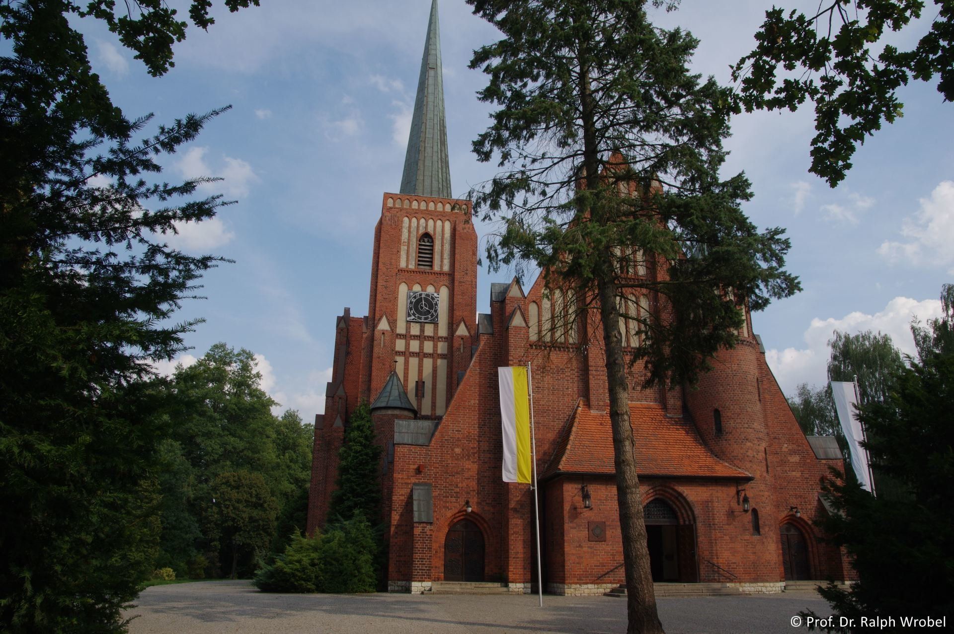 Die zweischiffige gotische Hallenkirche wurde im 14. Jahrhundert aus Ziegelsteinen erbaut. Seit 1527 ist sie evangelisch, nur unterbrochen zwischen 1700 und 1707. Bis 1547 stand die Kirche unter dem Patronat der Brieger Piastenherzöge. Nach einem Brand wurde der Innenraum zwischen 1743 und 1745 umgebaut, im 19. Jahrhundert zudem mehrfach renoviert. Er ist reich im Régence-Rokoko-Stil ausgestattet. Der quadratische Turm wurde 1754 errichtet und Ende des 18. Jahrhunderts aufgestockt.