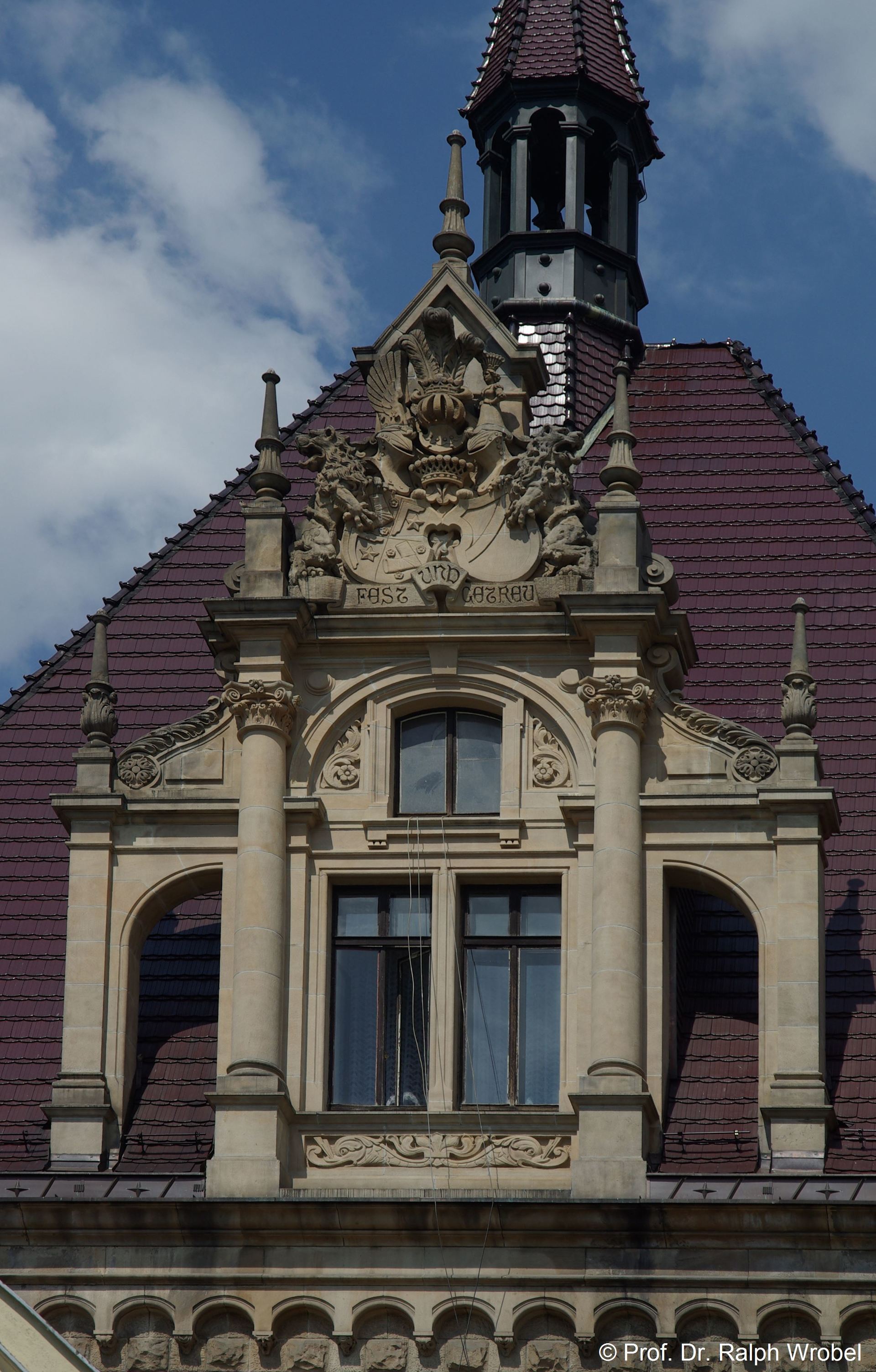 Dachfenster mit dem vereinigten Wappen der Familie von Tiele-Winckler