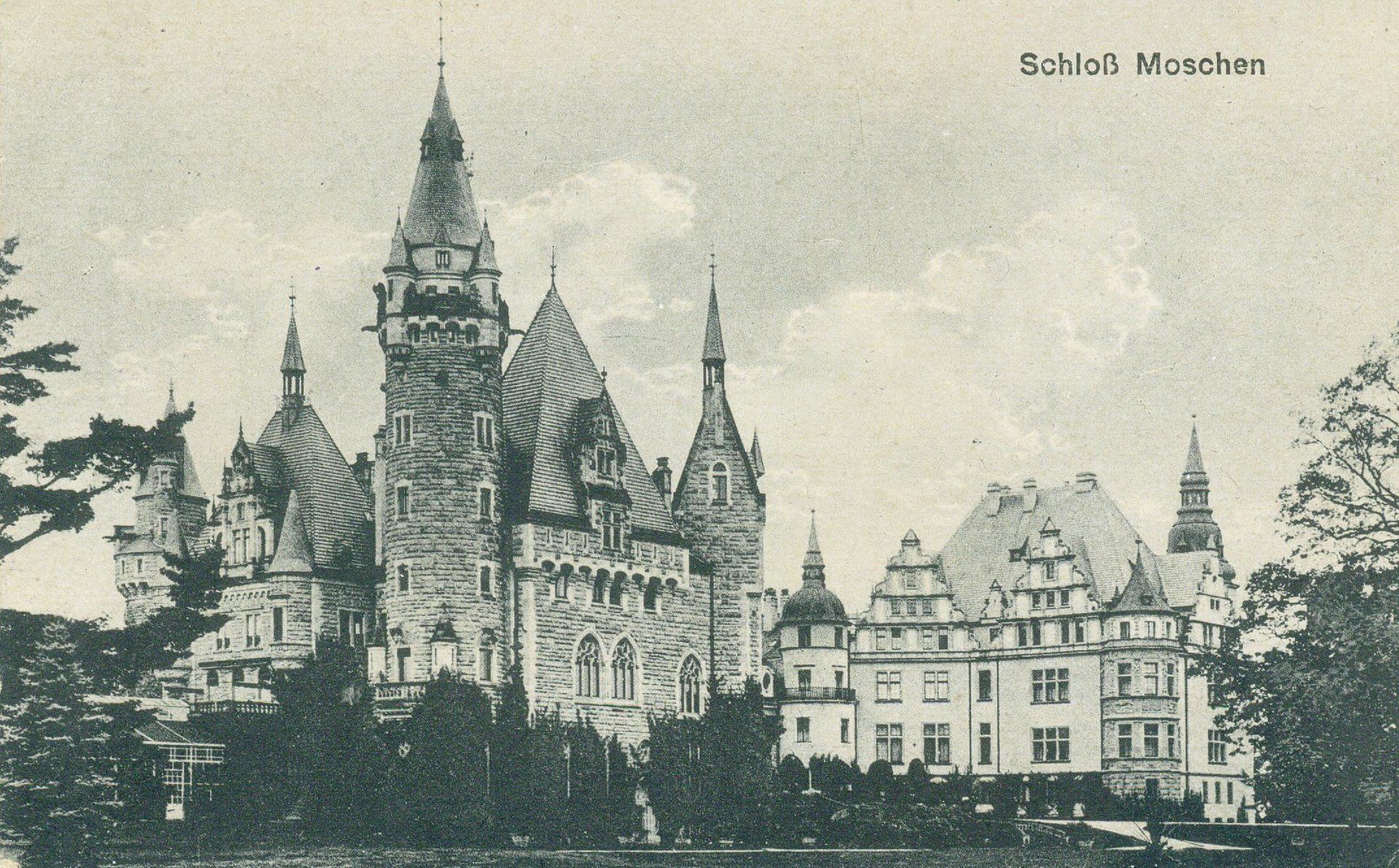 Der älteste Teil des Schlosses in Moschen stammt aus dem Anfang des 18. Jahrhunderts und wurde im barocken Stil errichtet. 1866 kaufte der oberschlesische Magnat Hubert von Tiele-Winckler die Anlage. Aber erst sein Sohn Franz Hubert ließ sie nach einem Brand im Jahre 1896 in zwei Phasen zu einer großartigen späthistorischen Schlossanlage auf H-förmigem Grundriss ausbauen. Dabei wurde der repräsentative Ostflügel im Stil der Burgenromantik mit Erkern und Rundtürmen neu errichtet. Die dabei genutzten Stilelemente stammen aus der Neogotik und Neorenaissance. Der Bau wurde 1914 abgeschlossen. Das Schloss soll 99 Türme und 365 Zimmer haben. Ziel des Baus dieser imposanten „Disney-Architektur“ war wohl der aus der niederen Herkunft der Familie stammenden Bedürfnis nach Prestige.