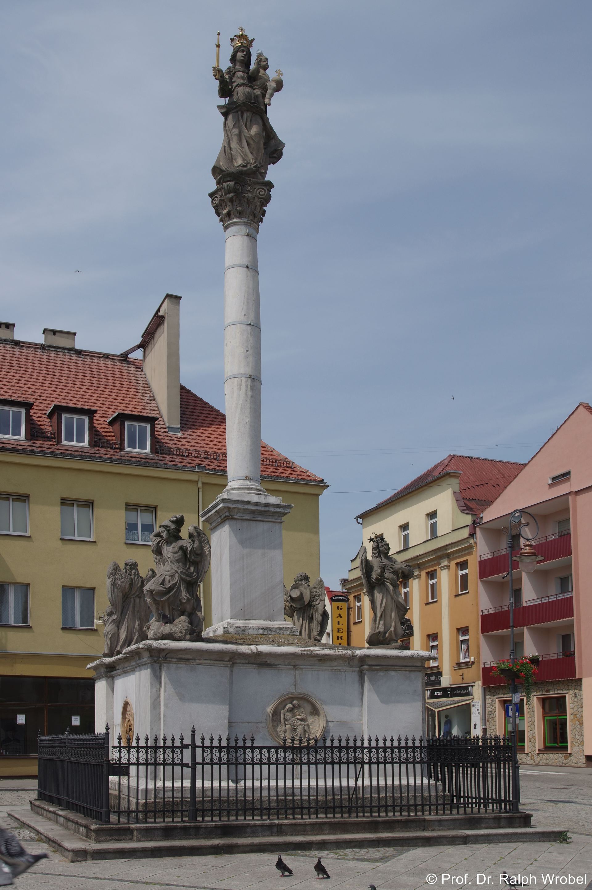 Der Ring von Neustadt ist heute ganz überwiegend von Nachkriegsbauten gesäumt. Sehenswert sind hier aber das Rathaus sowie die Nepomuksäule. (r.) Das Rathaus wurde an der Stelle des mittelalterlichen Vorgängergebäudes im Jahre 1782 im strengen friderizianischen Stil neu errichtet. Mitte und Ende des 19. Jahrhunderts wurde das Gebäude aufgestockt bzw. umgebaut. Der 1856 erhöhte Turm hat klassizistische Formen. Direkt neben dem Rathaus steht die Nepomuksäule von 1733, flankiert von zwei Engelsfiguren. Die Mariensäule in einer Ecke des Ringes stammt aus dem Jahre 1694. Sie steht auf einem quadratischen Sockel mit vier Figuren der Erzengel.