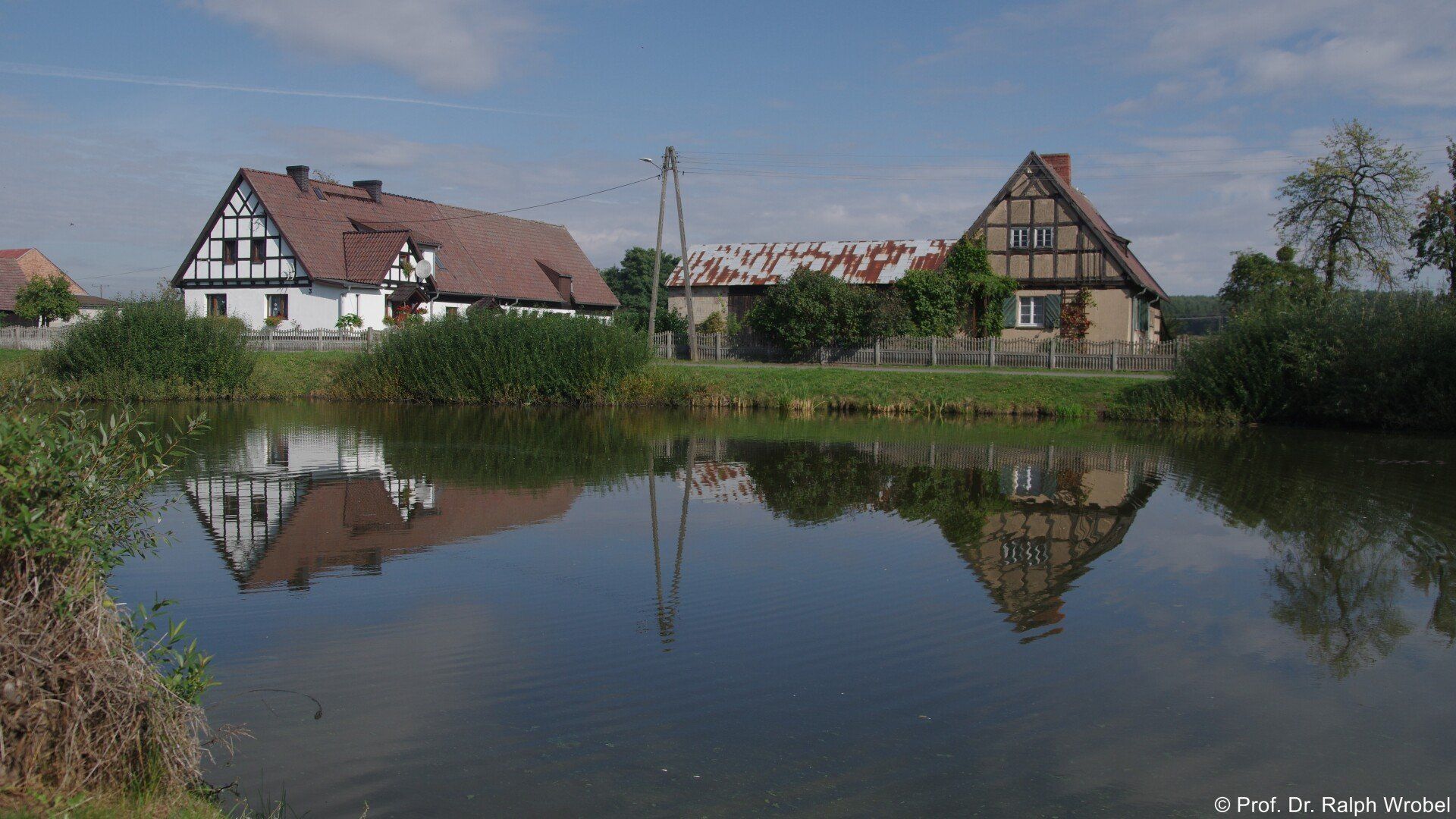 Zwischen dem Dorfkern und der Pfarrkirche befinden sich entlang der Straße eine Reihe quer zur Straße stehende, gleichartige Häuser mit gemauertem Erdgeschoss und aus Fachwerk bestehendem Obergeschoss unter einem Satteldach. Diese Häuser gehören zu einer in den 1930er Jahren gebauten Wohnsiedlung, in die die Umsiedler aus den gefluteten Gebieten des Turawa-Stausees umgesiedelt wurden.