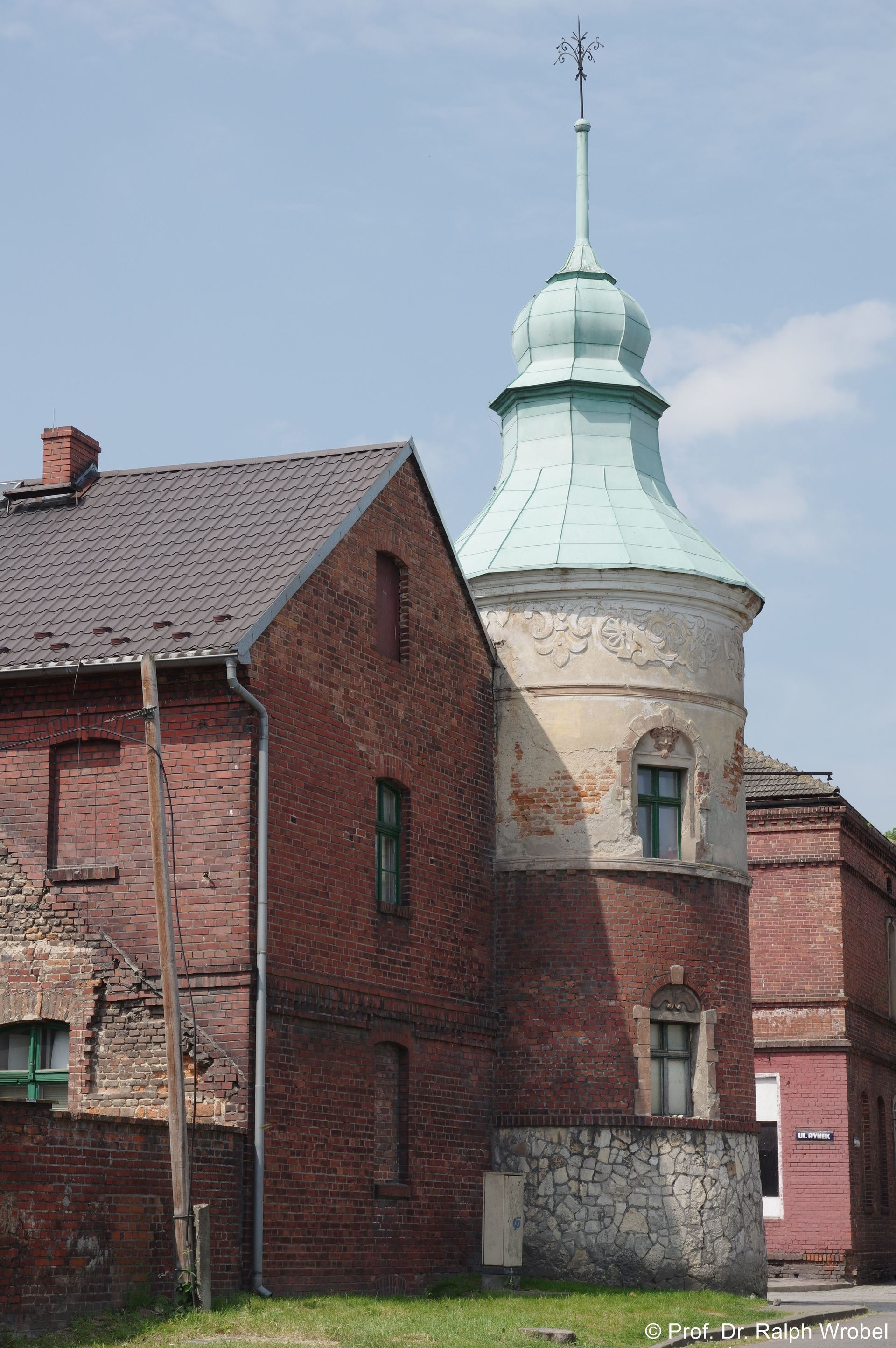 Das Schloss geht vermutlich auf eine mittelalterliche Wasserburg zurück, denn noch heute lässt sich im Süden und Osten der Anlage ein Graben sehen. Das Schloss wurde 1617 von Friedrich von Oppersdorff im Renaissancestil erbaut sowie Ende des 19. Jahrhunderts von den Grafen von Matuschka umgebaut. Der dreigeschossige Rechteckbau hat an der Westfassade zwei oktogonale Ecktürme und ein Neorenaissance-Portal mit vorgelagerter Treppe von 1894. (u.l.) Die Ostfassade ist durch eine Terrasse aufgelockert. (u.r.) Nachdem das Schloss am Ende des Zweiten Weltkrieges enormen Schaden genommen hatte, wurde es in den Jahren 2012 bis 2014 renoviert. Derzeit wird nur das Erdgeschoß durch die Gemeindeverwaltung genutzt. Die Räume sind um eine Diele – vermutlich den ehemaligen Innenhof der Schlossanlage – in umlaufender Folge angelegt.