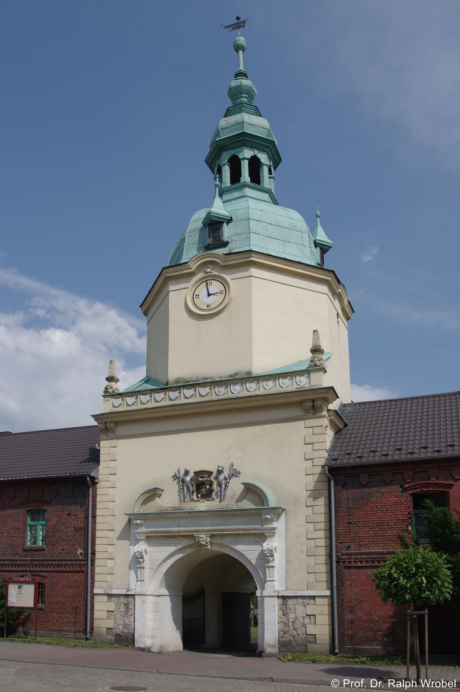 Die Nebengebäude des Schlosses mit barockem Torturm aus dem Jahre 1670 und aufwendig gestaltetem Neorenaissance-Portal von 1894 stellen die Grenze zwischen dem eigentlichen Ort und dem Schlossbereich dar.