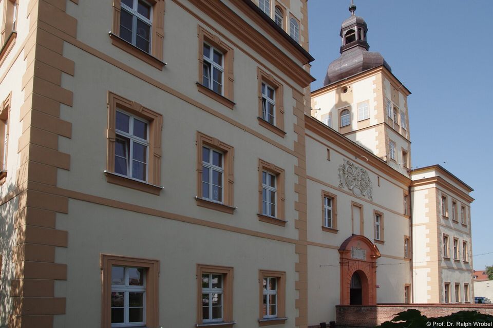 Ab 1563 wurde auf Geheiß des Grafen Georg Proskowski anstelle einer vormaligen gotischen Burg das Schloss als vierflügelige und dreigeschossige Anlage mit Arkadeninnenhof, Wassergraben und bastionsartigen Eckbauten im Renaissancestil erbaut. Nach dem Brand 1644 wurde das Schloss unter Graf Georg Christoph Proskowski zwischen 1677 und 1683 wiederaufgebaut und teilweise barock ausgestattet. In diesen Jahren wurden auch die beiden Türme in der Hauptfassade errichtet. Von 1847 bis 1923 beinhaltete das Schloss eine landwirtschaftliche Lehranstalt, seit 1930 ein Krankenhaus für geistig Behinderte.