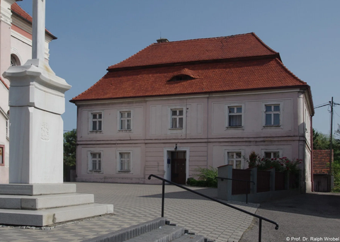 Vor der Kirche befindet sich eine Johannes Nepomukfigur aus dem Jahr 1756, verziert mit einem Wappen der Familie Proskowski. Daneben steht das Pfarrhaus aus der Zeit um 1770. Es hat eine rahmengegliederte Fassade mit Füllungen sowie ein Mansarddach.