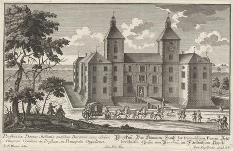 Der Ort und die dort ansässige Adelsfamilie Proskowski (oder: von Proskau) werden im Jahre 1311 erstmals urkundlich durch „Beldo de Proscow“ erwähnt. Vom 14. Jahrhundert an bis 1769 war das ganze Gebiet um den Ort Proskau im Besitz dieser Familie. Um das Jahr 1560 baute Georg Proskowski das alte Dorf Proskau durch Erweiterung der Dorfstraße zu einem langgezogenen Anger zum Städtchen mit 38 brauberechtigten Häusern aus. Damit wurde Proskau zu einer der kleinsten Städte Oberschlesiens. Ab 1563 ließ Graf Proskowski das Schloss im Renaissancestil erbauen. Während des Dreißigjährigen Krieges wurde das Städtchen 1644 von schwedischen Truppen abgebrannt. Graf Georg Christoph Proskowski ließ das Schloss um 1680 erneuern und machte aus seinem Besitz einen Fideikommiss, einen unveräußerlichen und unteilbaren Familienbesitz.