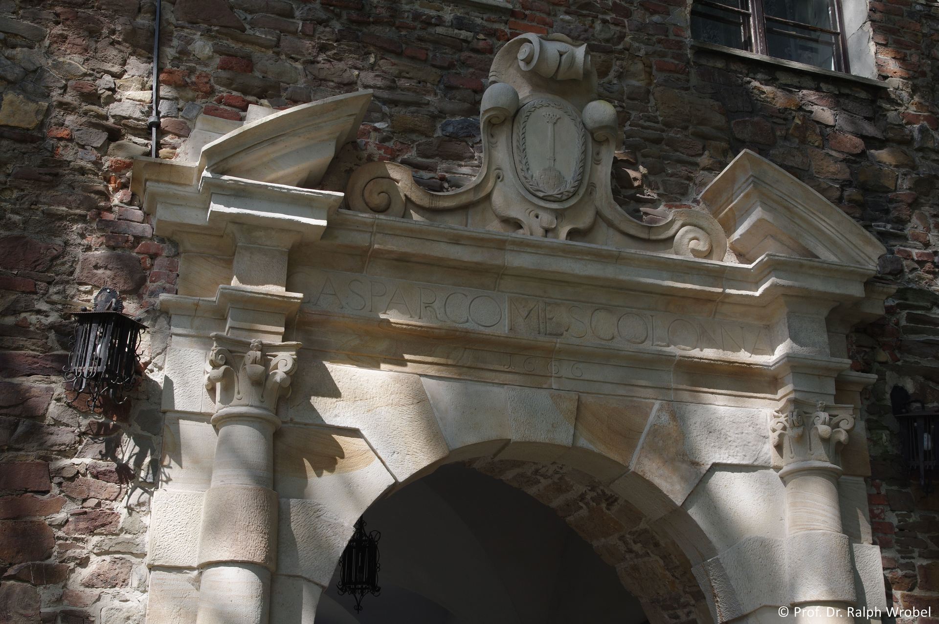 wurde ursprünglich im 15. Jahrhundert errichtet, später umgebaut und zwischen 1650 und 1666 mit Türmen umgestaltet. Heute zeigt das barocke Gebäude noch Teile der gotischen und Renaissance-Mauern. In der Mitte befindet sich eine kreuzgratgewölbte Durchfahrt mit einem steinernen Rundbogenportal. Dieses ist gerahmt von Halbsäulen, darüber ein Gebälk mit Wappenkartusche der Familie Colonna.