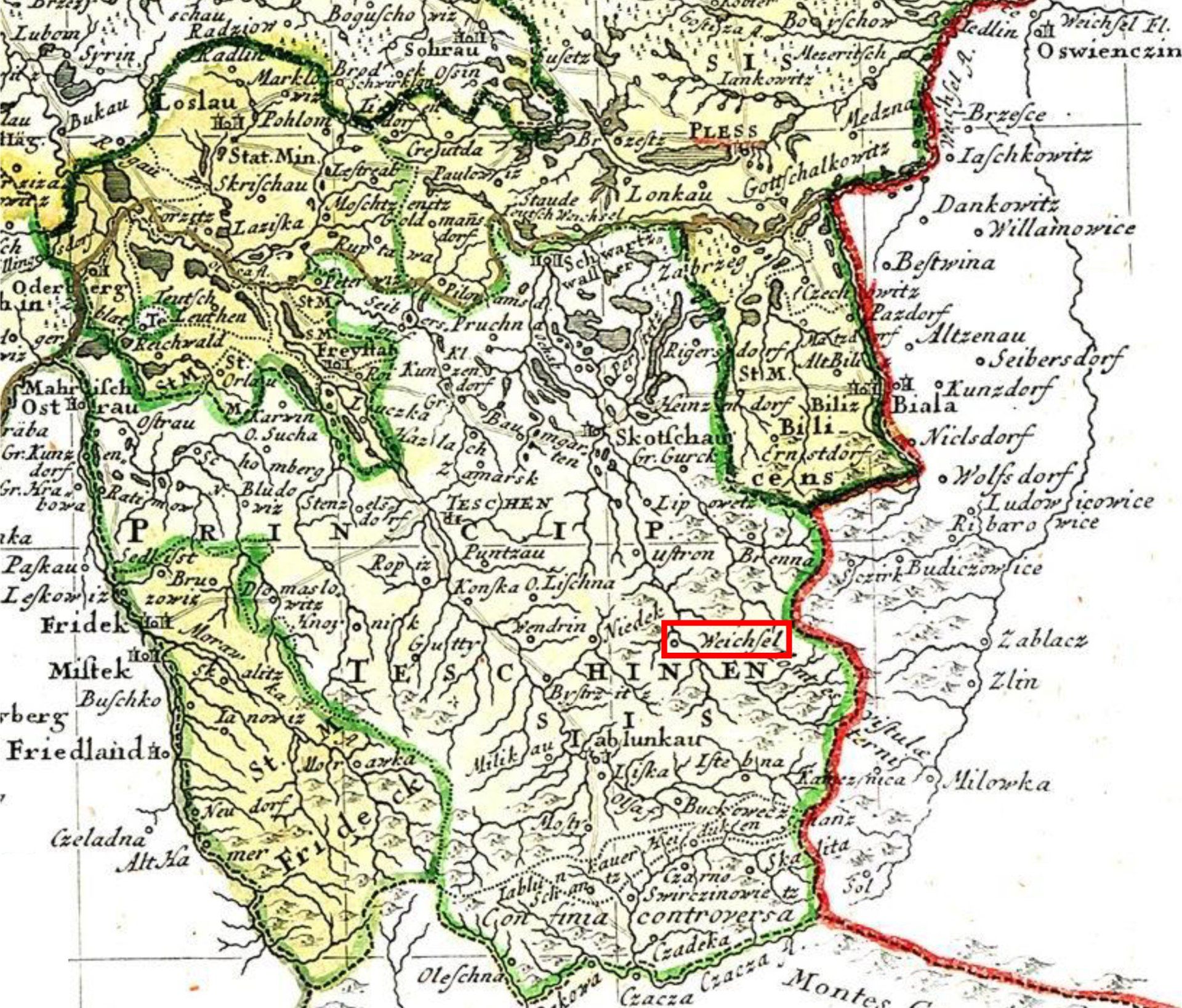 Das Waldgebiet um Weichsel wurde erst seit beginn des 17. Jahrhunderts von Holzfällern, Walachen (romanischsprachigen Südosteuropäern) und evangelischen Glaubensflüchtlingen aus den nördlichen Landesteilen des Herzogtums Teschen besiedelt. Die Menschen hier lebten v.a. von der Waldwirtschaft und der Schafzucht. Der Ort Weichsel wird erstmalig in einer Urkunde des Jahres 1615 erwähnt, in der die Abgaben der örtlichen Mühle geregelt werden. Als der Ort im Jahre 1653 an die Habsburger fiel, wurde im Rahmen der Gegenreformation zuerst die evangelische Kirche im Ort abgerissen. Trotzdem siedelten sich im Ort weitere Protestanten an, die den Gottesdienst allerdings im Geheimen in den naheliegenden Wäldern halten mussten. Am Ende des 18. Jahrhunderts war der Ort fast komplett evangelisch. Erst durch das Toleranzpatent Kaiser Josephs II. aus dem Jahre 1782 erhielt die evangelische Gemeinde wieder das Recht zum Bau einer eigenen Kirche.